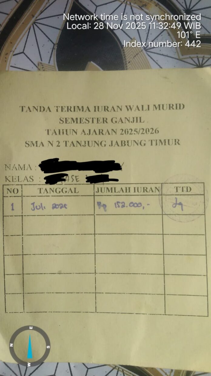Dinamisnewscom – Tanjung Jabung Timur — Pungutan berbentuk iuran yang dilaksanakan oleh SMA Negeri 2 Tanjung Jabung Timur (Tanjabtim) bersama Komite Sekolah terhadap orang tua siswa tahun ajaran 2025–2026 menuai polemik.